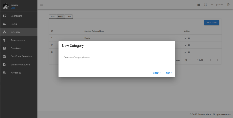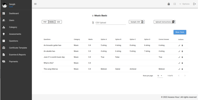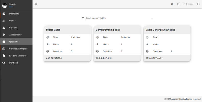 List of assessments in box shape with some other fields will be viewed here and you can add question by filling below fields