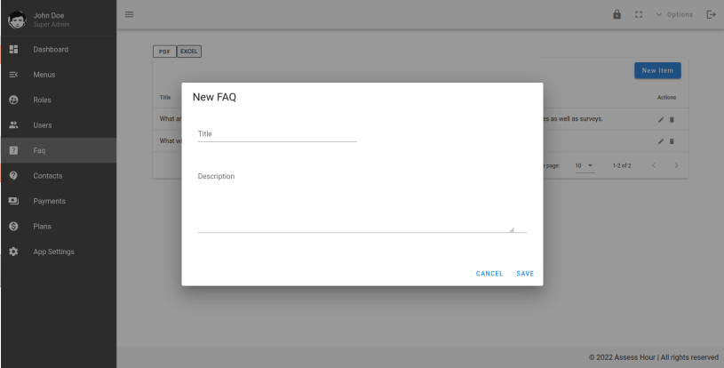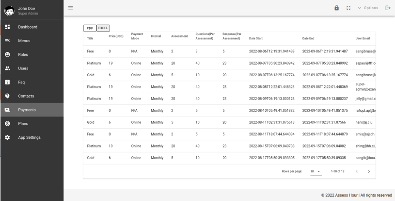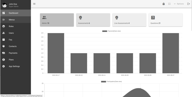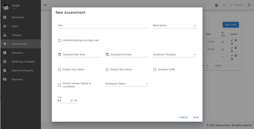 Assess Hour is a single page(SPA) web application / platform for online Assessments, tests, surveys, quizzes and exams. It's best suited for the online evaluations and skills assessment for the educational institutions, companies, corporations and agencies. You can start your own SaaS businees with Assess Hour, also your customers can earn money by selling their own assessments.