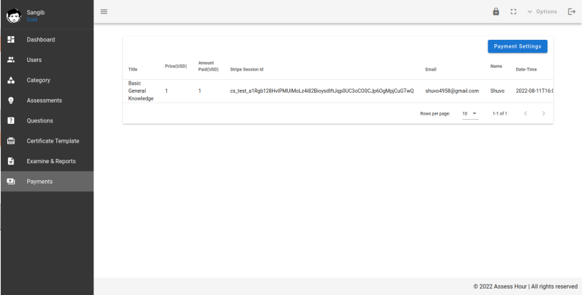 Here you can see all payments data of your paid assessments. Also you need to set your Stripe  secret key to accept payments for paid assessment by clicking Payment Settings button on top right corner.