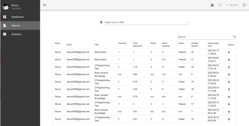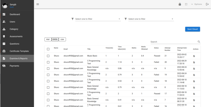 All your candidates exam records will find here and examine options will visible for descriptive questions assessments. You can filter those and can download those on PDF,CSV & Excel. Also here you find a Sent Email button, use that if you want to sent email to your selected candidates.