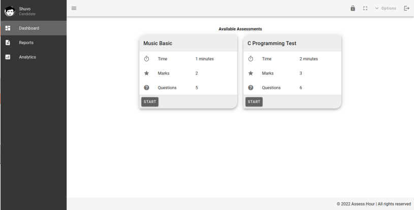 On candidate dashboard, you can see all your available assessments and can start by clicking the start button.